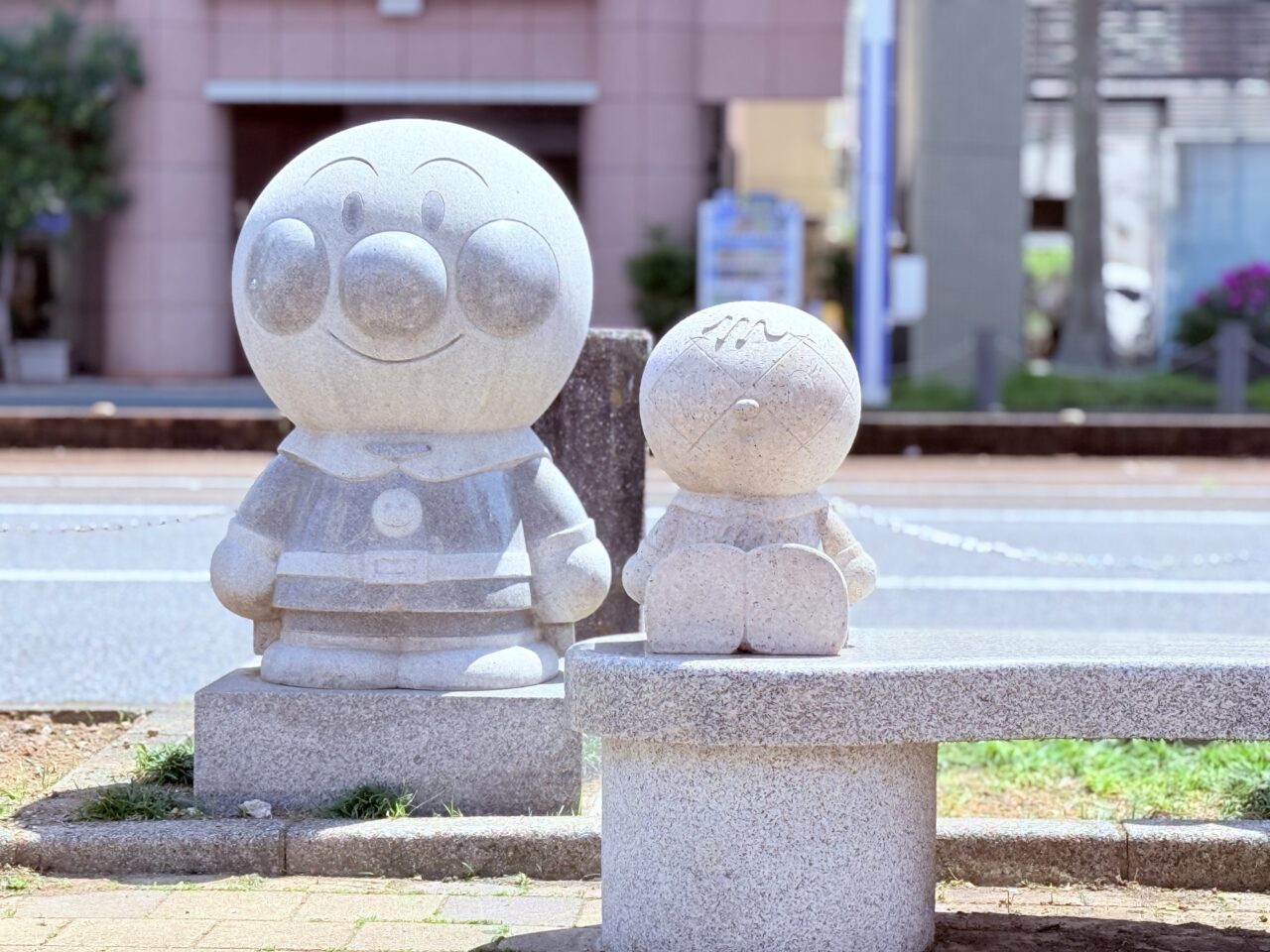 アンパンマンとジャムおじさんの像。こちらの場所では平日、休日、長期休暇問わず、記念撮影をしている方をよく見かけます。地元の人でも小さな子供連れの家族がよく訪れるようです。