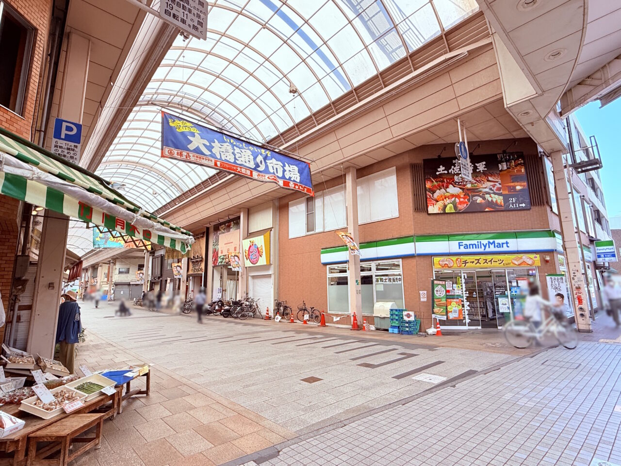 ひろめ市場の南側入口方面にある大橋通り商店街を抜け、正面にある大きな道路を渡ります。向かい側には天神橋商店街があります。