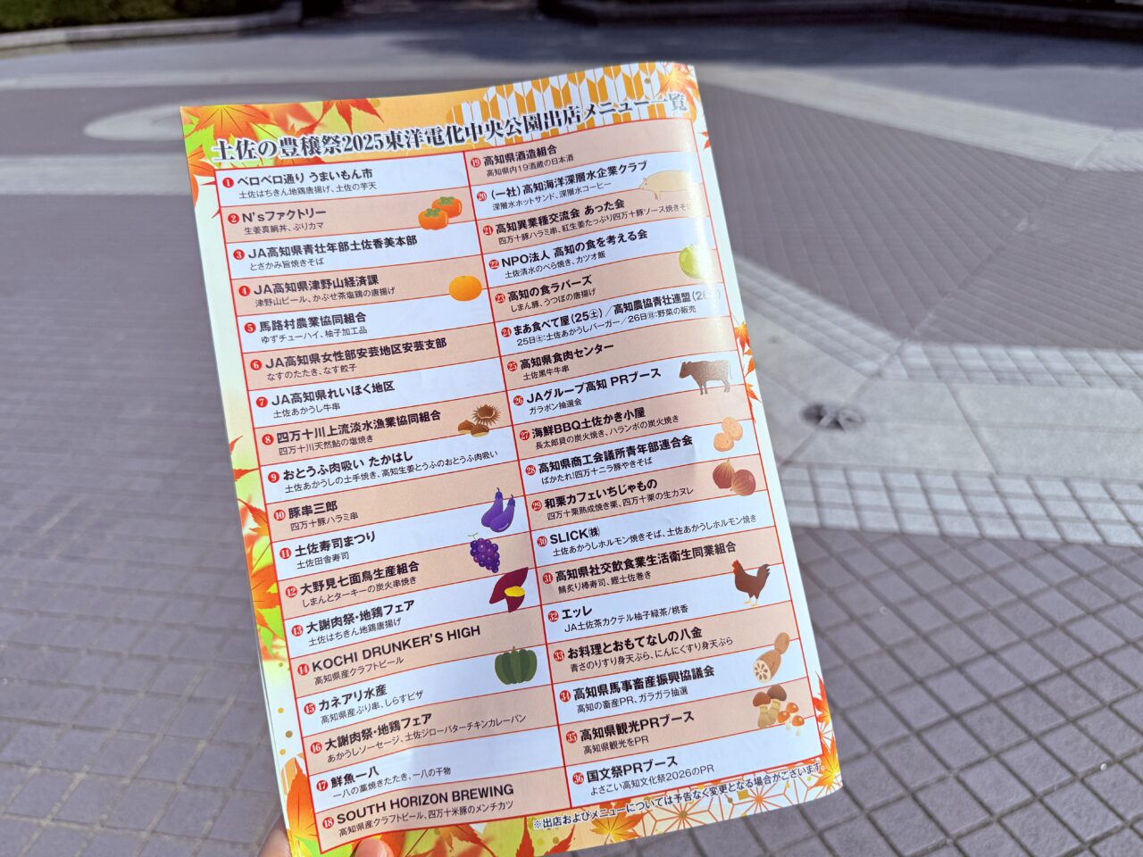 秋になると高知のあちこちで開催される恒例イベント「土佐の豊穣祭」。県内の旬の食材やご当地グルメが一堂に会する人気のイベントで、毎年多くの人で賑わいます。2025年10月25日・26日の2日間は、東洋電化中央公園で「土佐國美味集結」が行われ、県内の野菜や肉、魚などのグルメが集結します。