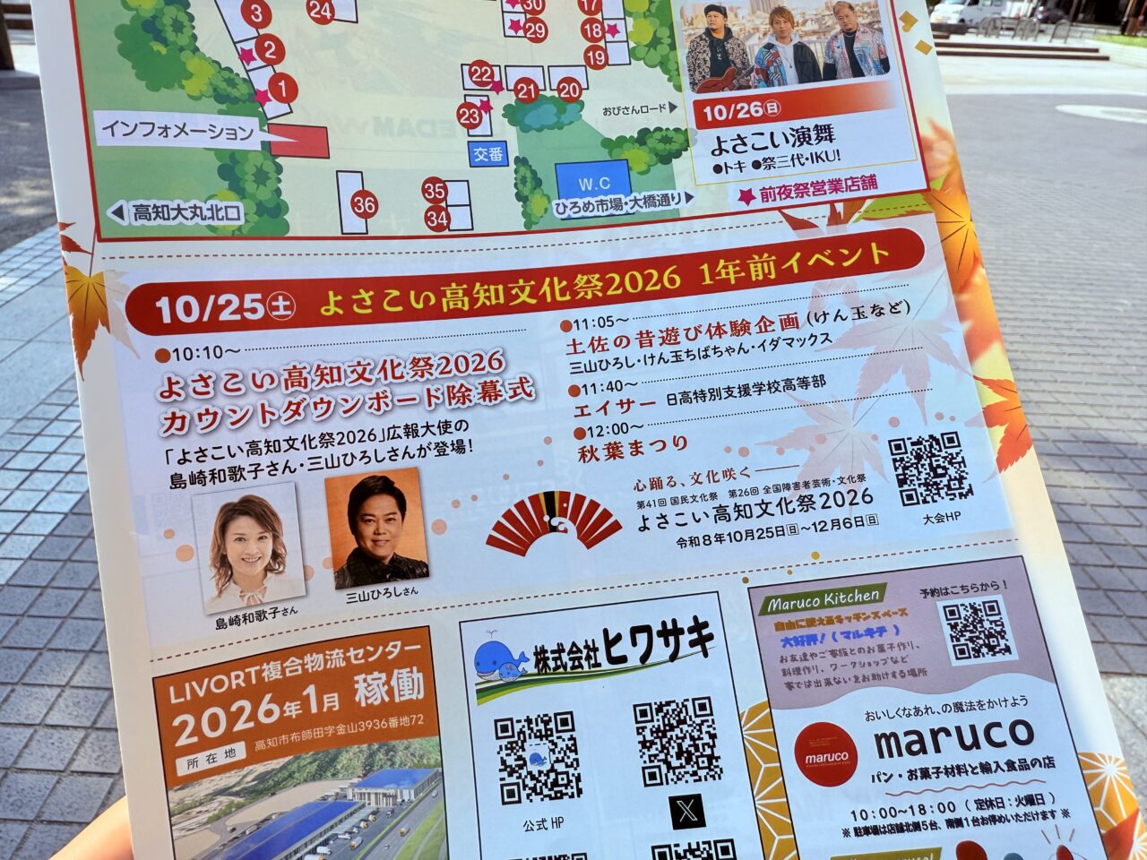 ステージでは来年2026年10月25日から開催される「よさこい高知文化祭2026」の1年前イベントも開催されます。アンバサダーの島崎和歌子さんや三山ひろしさんも登場し、グルメ以外にもお楽しみがいっぱいです!