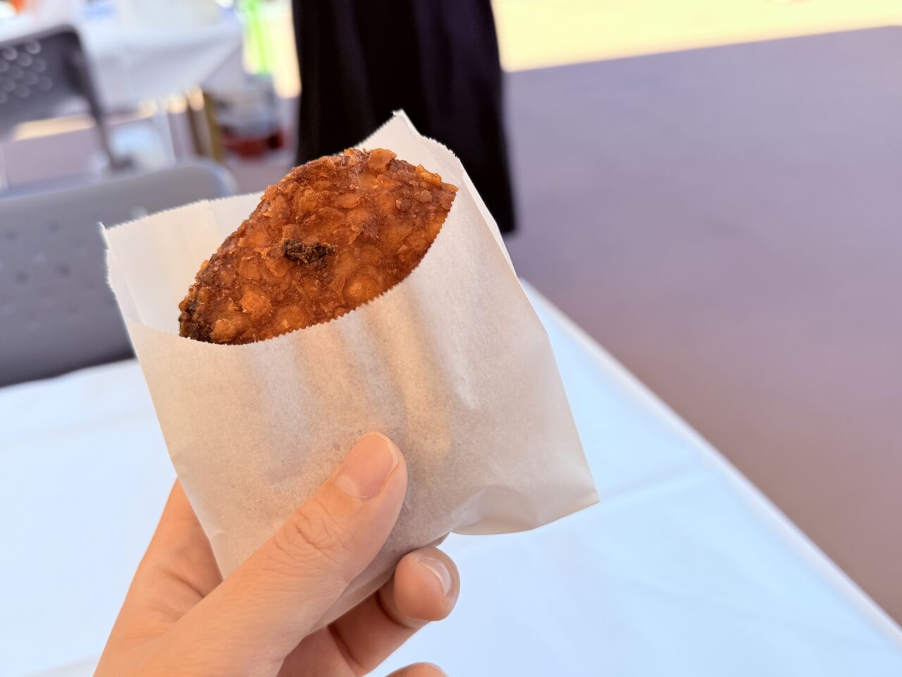 今回、会場でいただいたのは、「淡路島金賞カレーパン サンハート」さんの「お芋チーズカレーパン」。揚げたてをいただきました!(出口のほうに飲食スペースがあります。)