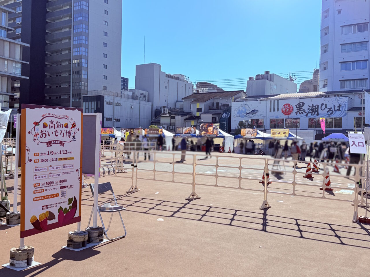 「高知おいも万博」が開催されているのはおまち多目的広場。北側に入り口が、東側に出口や飲食スペースがあります。