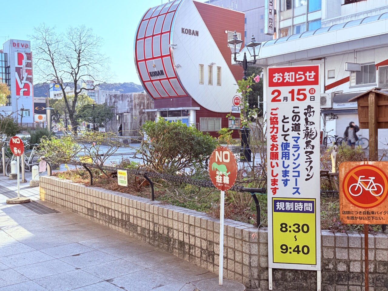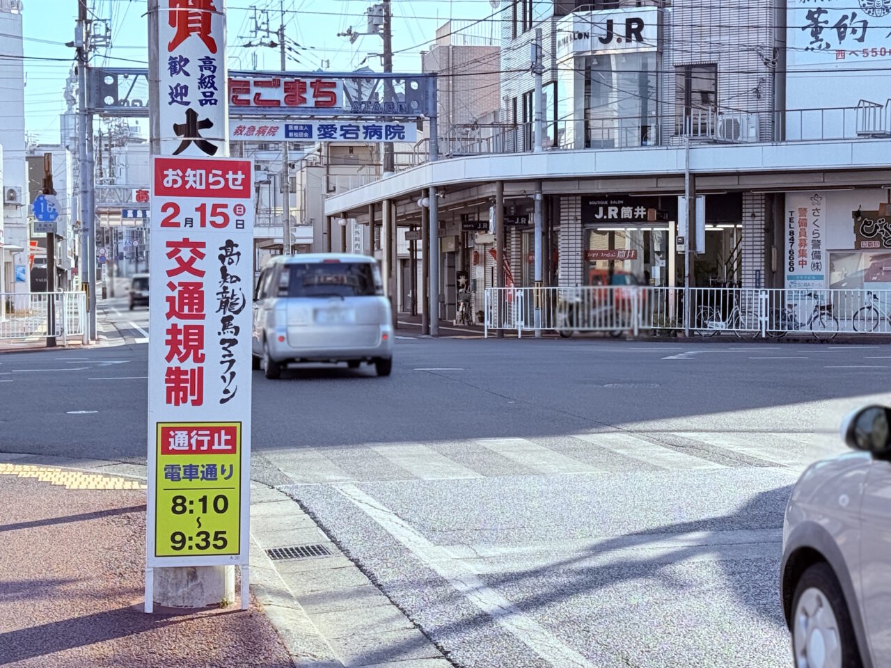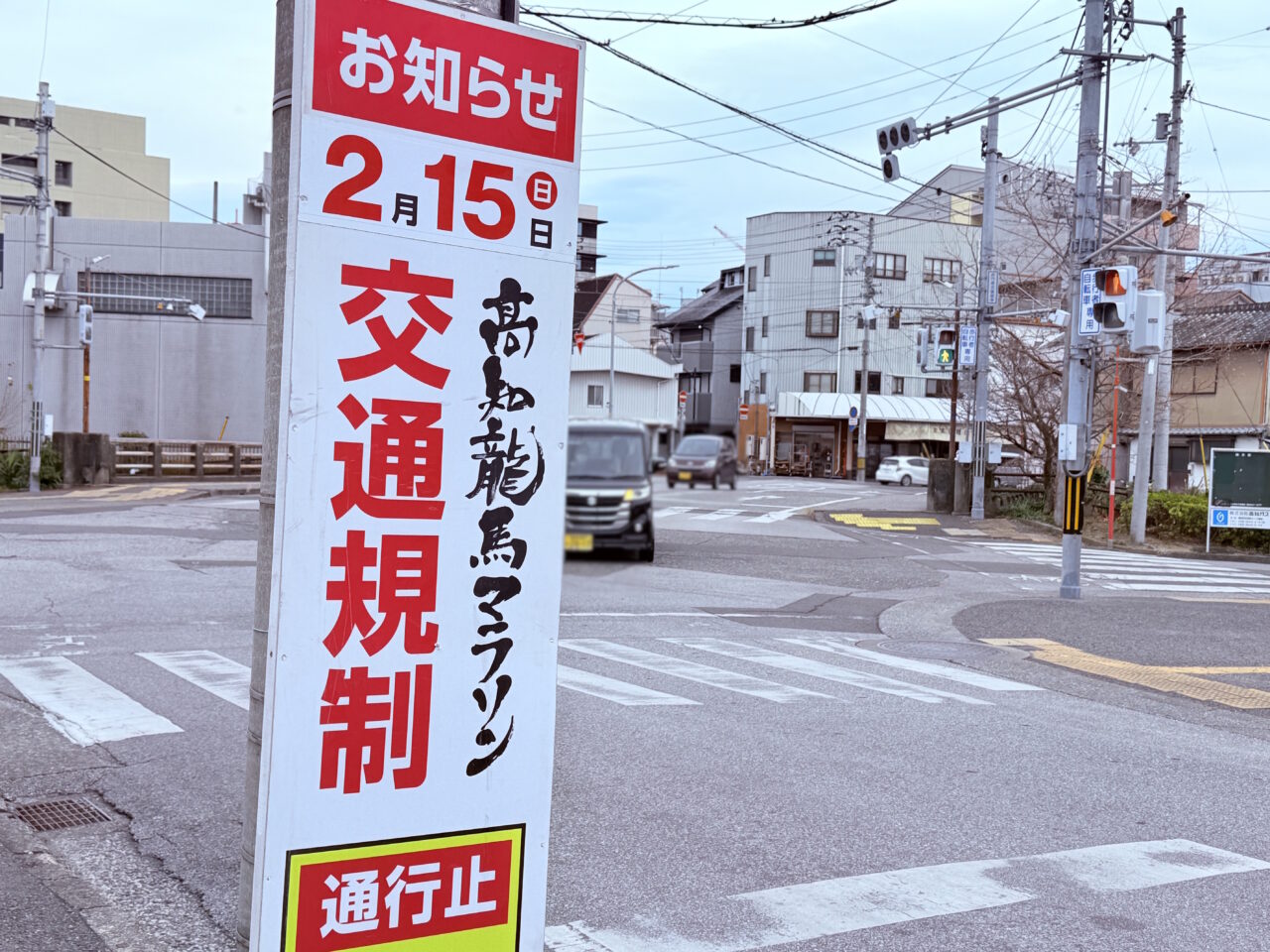 今年2026年の「高知龍馬マラソン」の開催日は2月15日。開催日が近づいてきました。それに伴って、高知市内の各所に交通規制に関する案内板が設置されています。