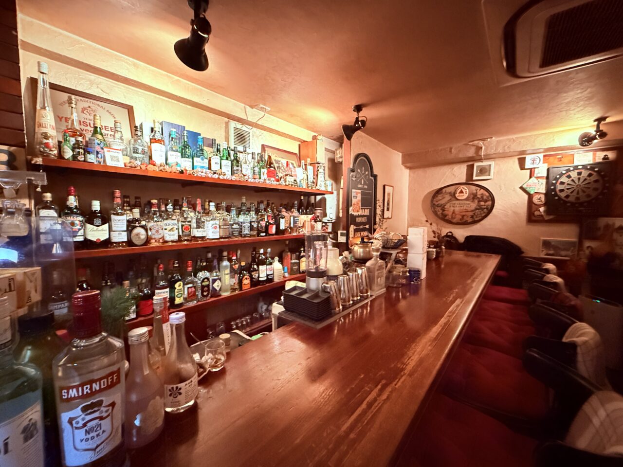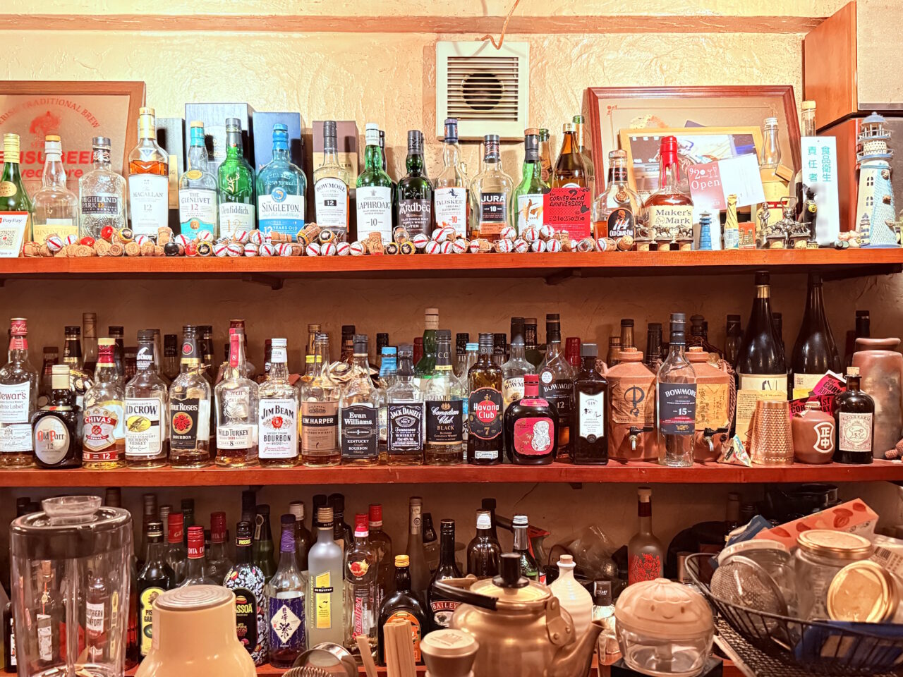カウンター席から見える戸棚には、お酒の瓶がぎっしり!200種類ほどのお酒があるそうです。