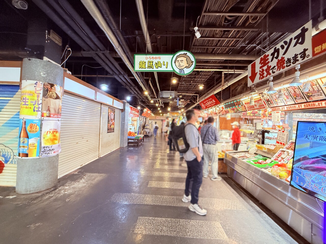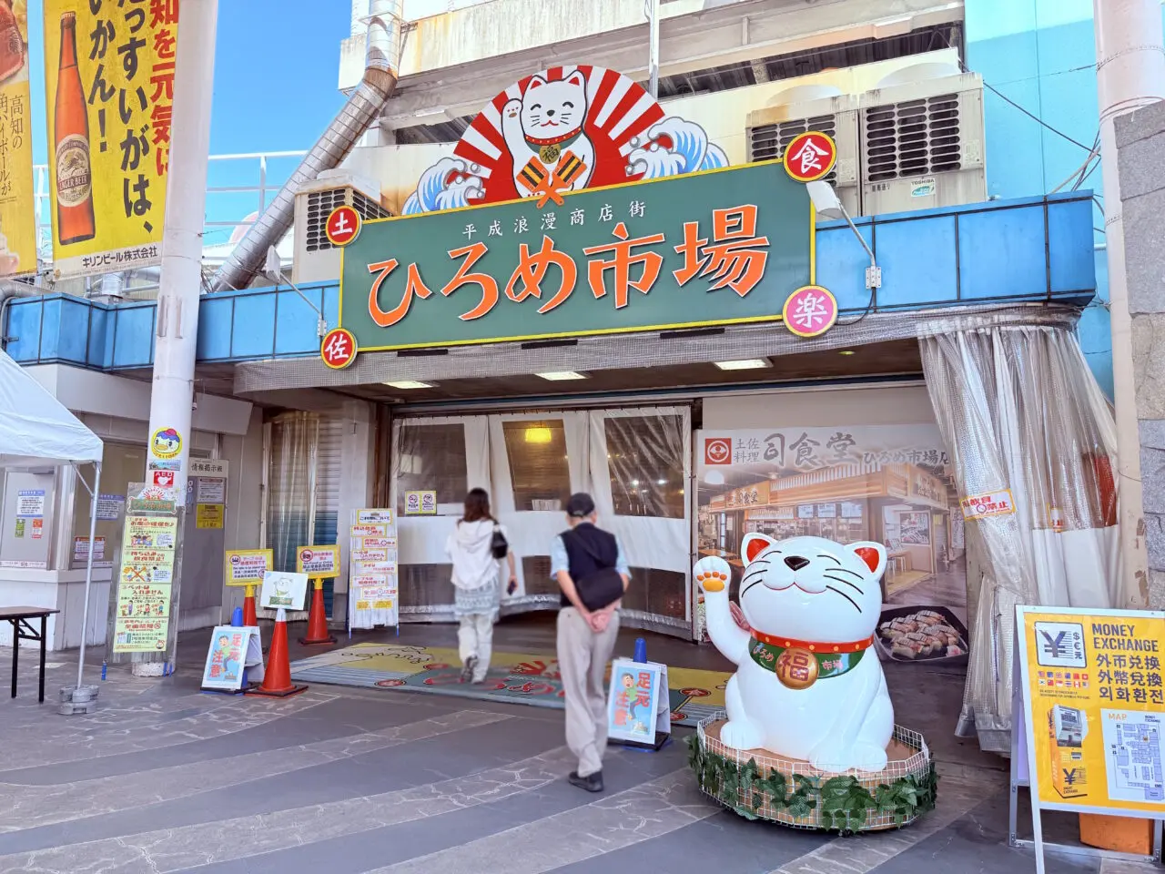 「揚げたて天ぷら 土佐魚菜市場」があったのはひろめ市場の南側。ひろめ市場のマスコットキャラクター「ひろめ市場の猫」がいる入り口から入ってすぐの場所です。